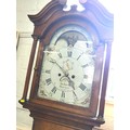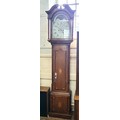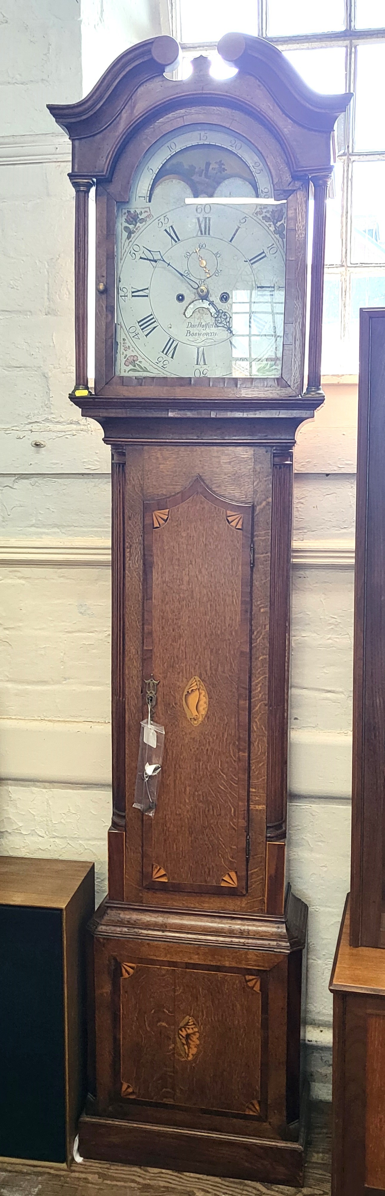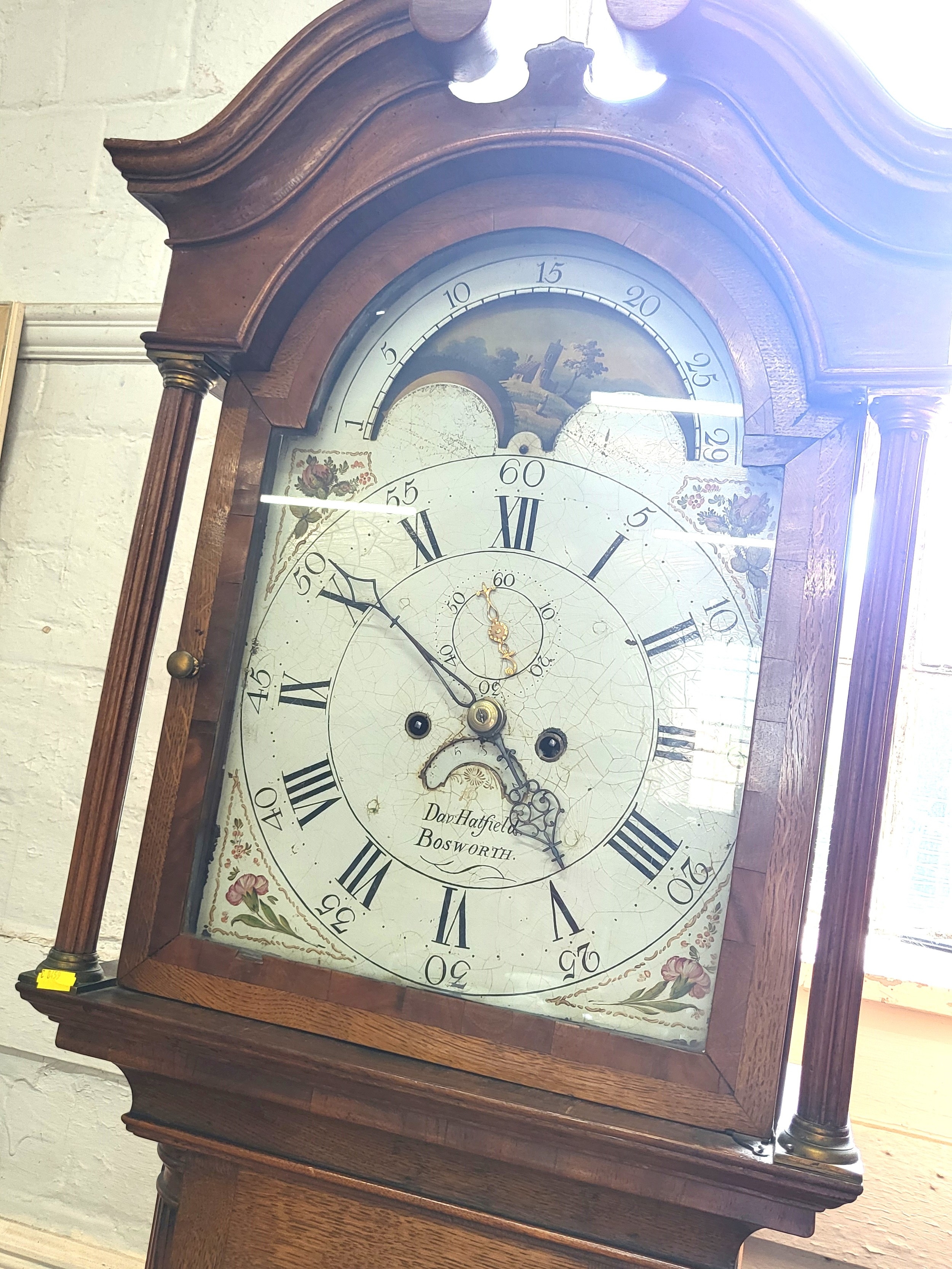 A longcase clock in working order, complete with keys. Clock face marked 'Dav Hatfield Bosworth'. H: 217cm W: 55cm D: 27cm. Moon dial in need of attention.