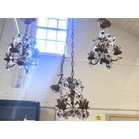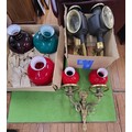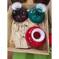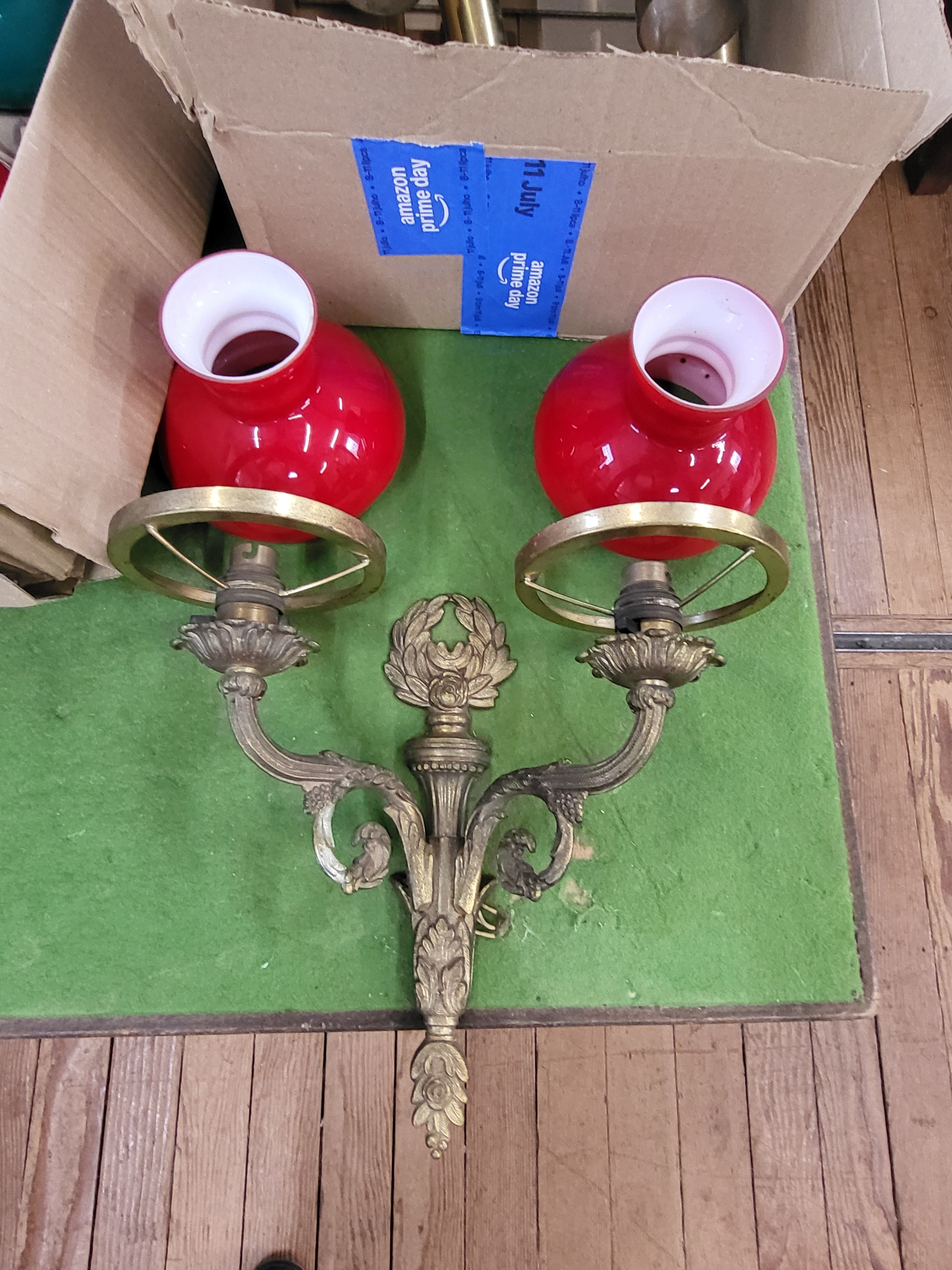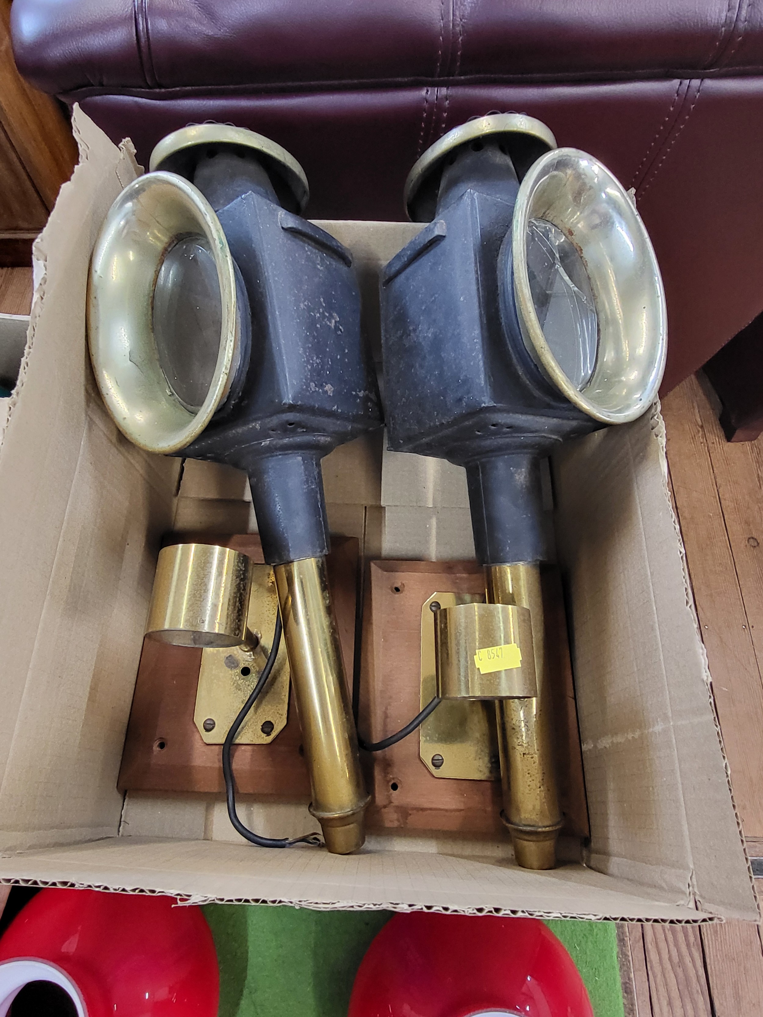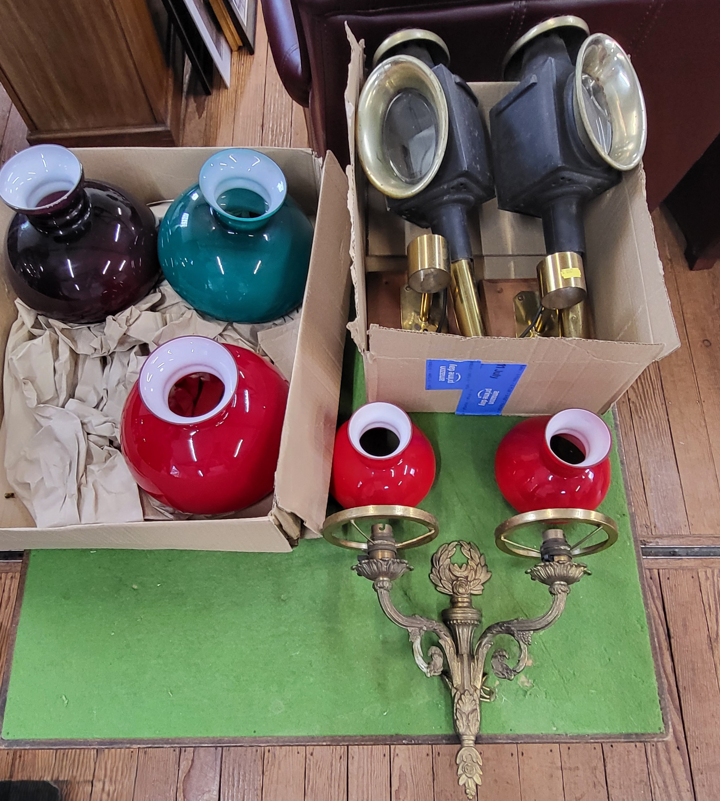 Two coach lanterns H:45cm, brass double wall sconce with shades H:29cm W:33cm and three glass coloured oil lamp shades H:16cm W:22cm.