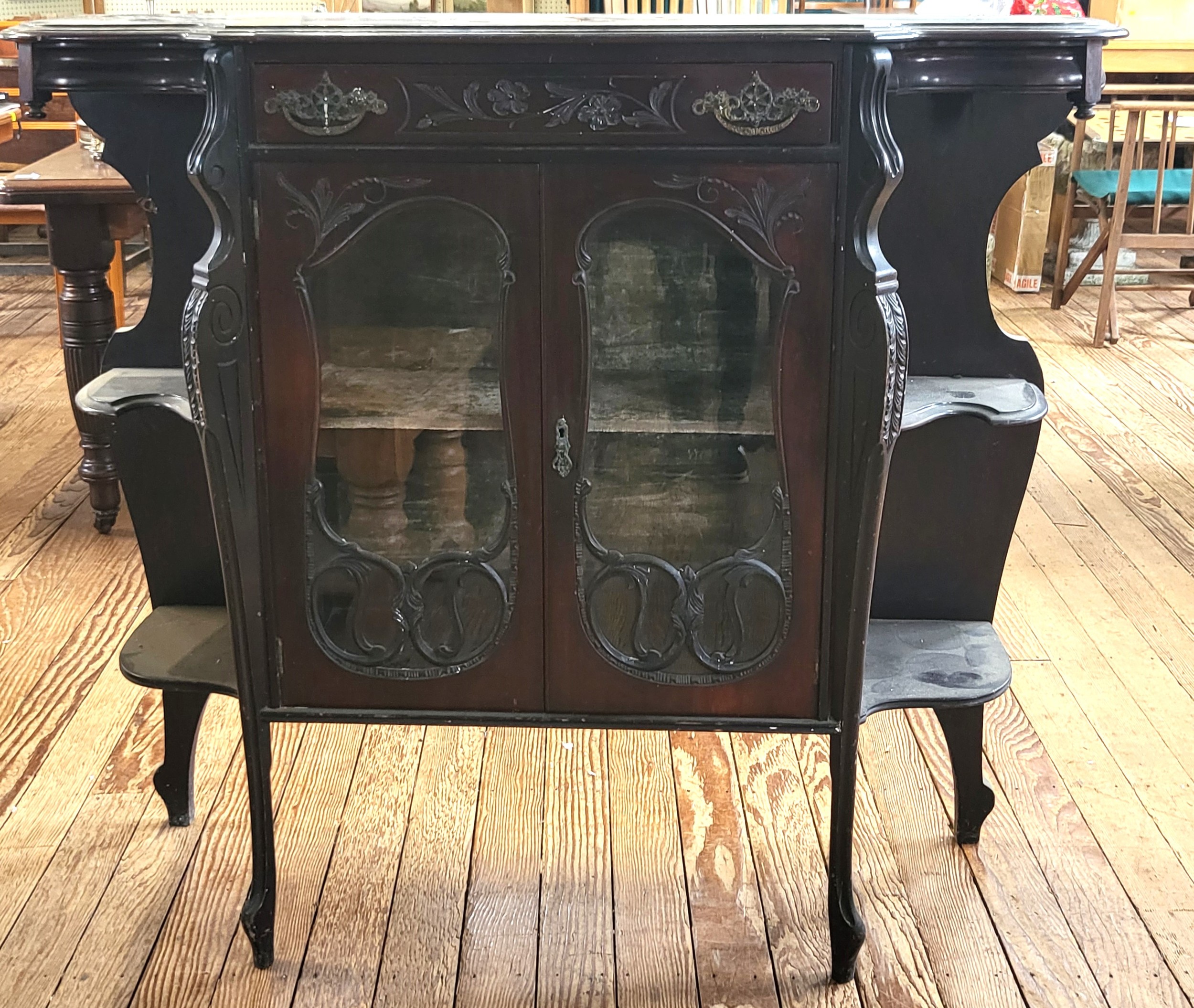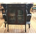 A Victorian carved mahogany chiffonier with velvet shelves, a single drawer over two glazed doors, flanked by shelves, and raised on four legs.