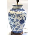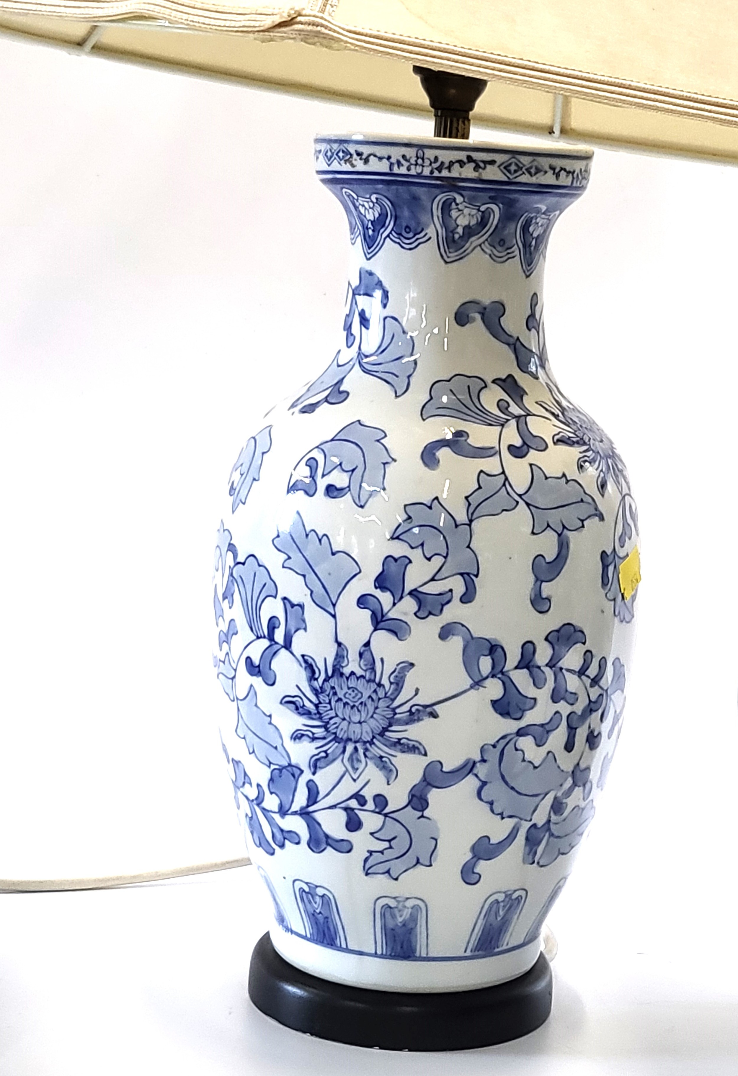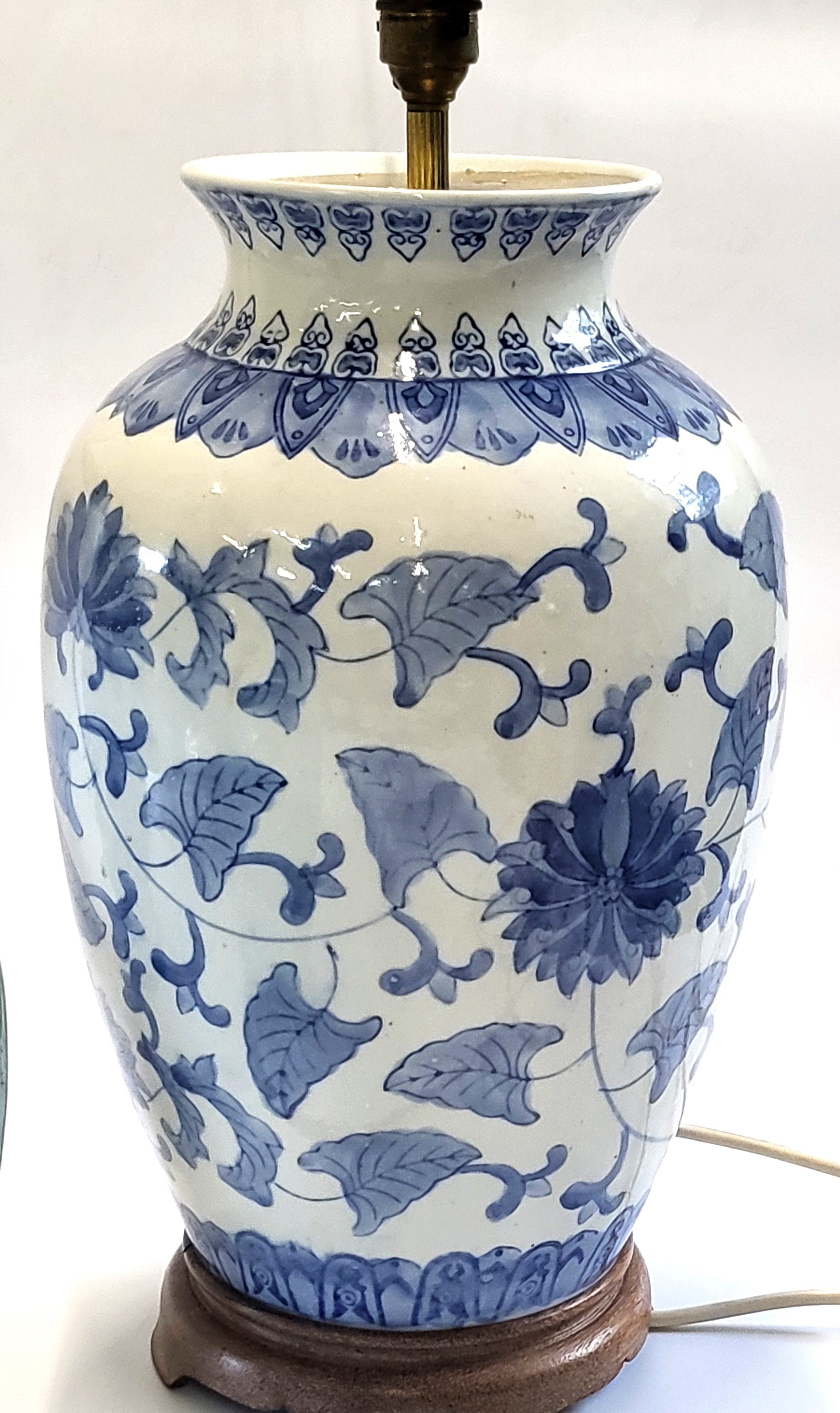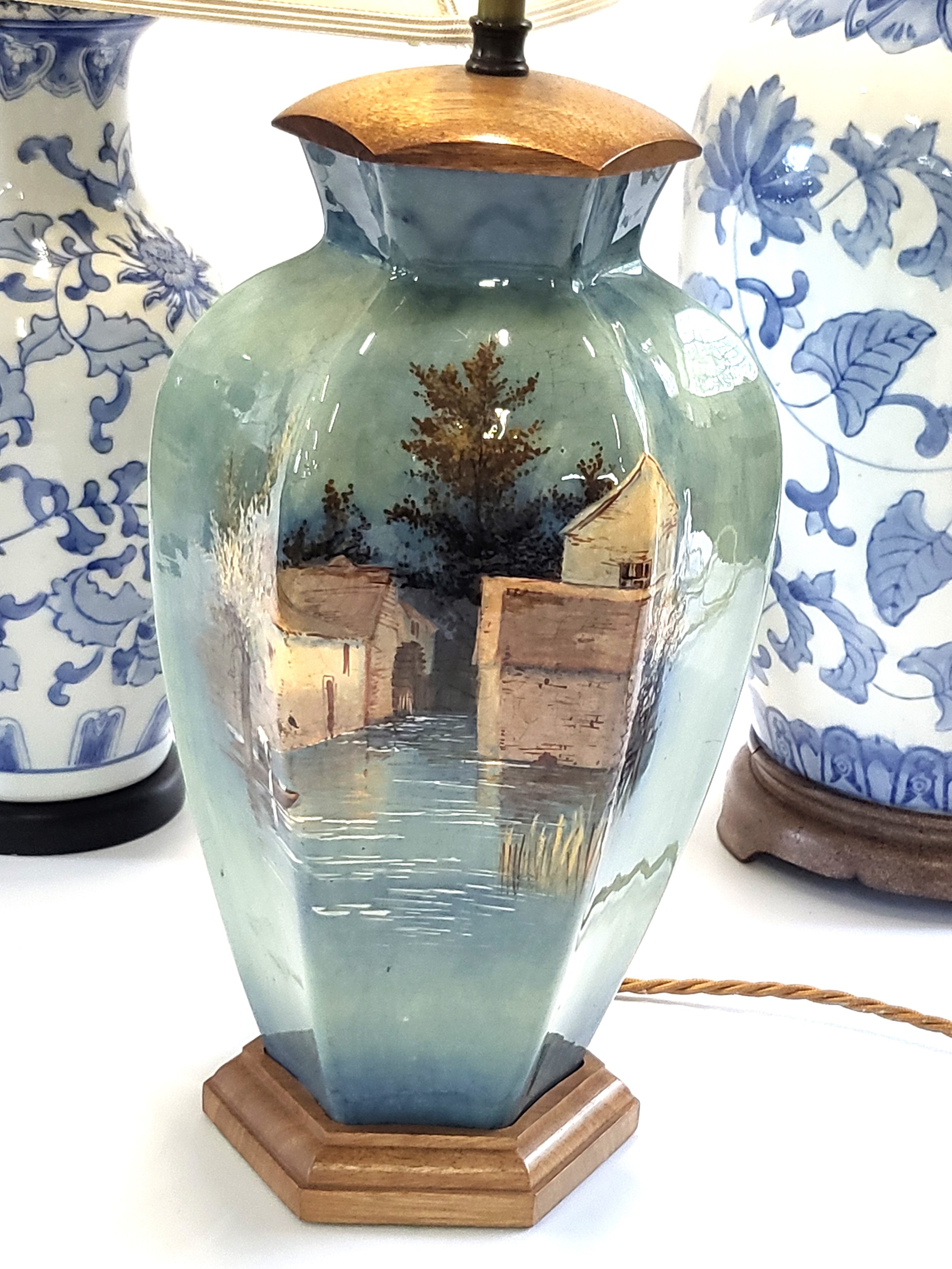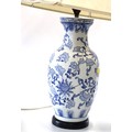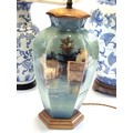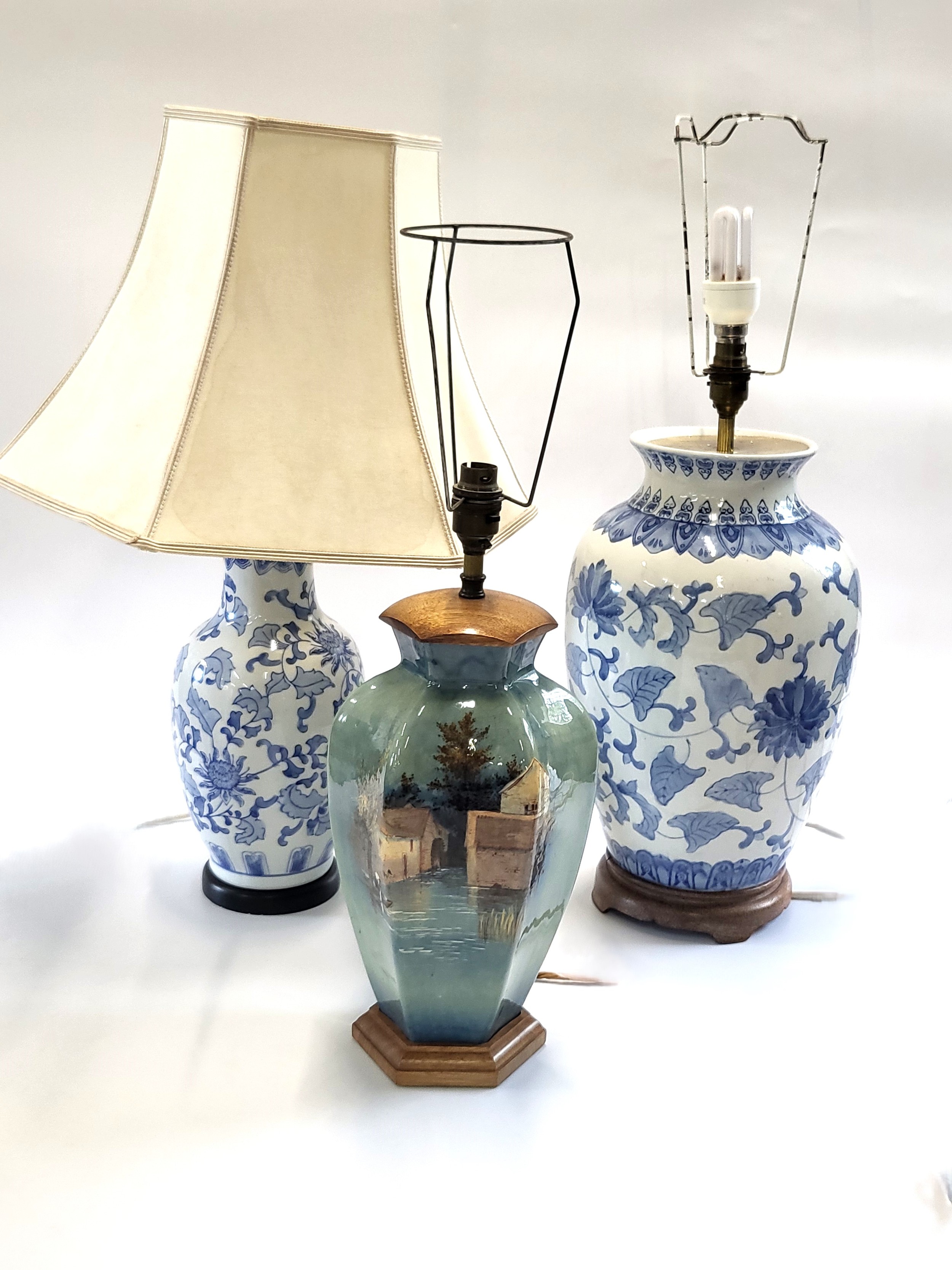 Two blue and white lamps in Oriental style and a turquoise lamp with flooded village scene Heights between 60cm to 64cm. (3)