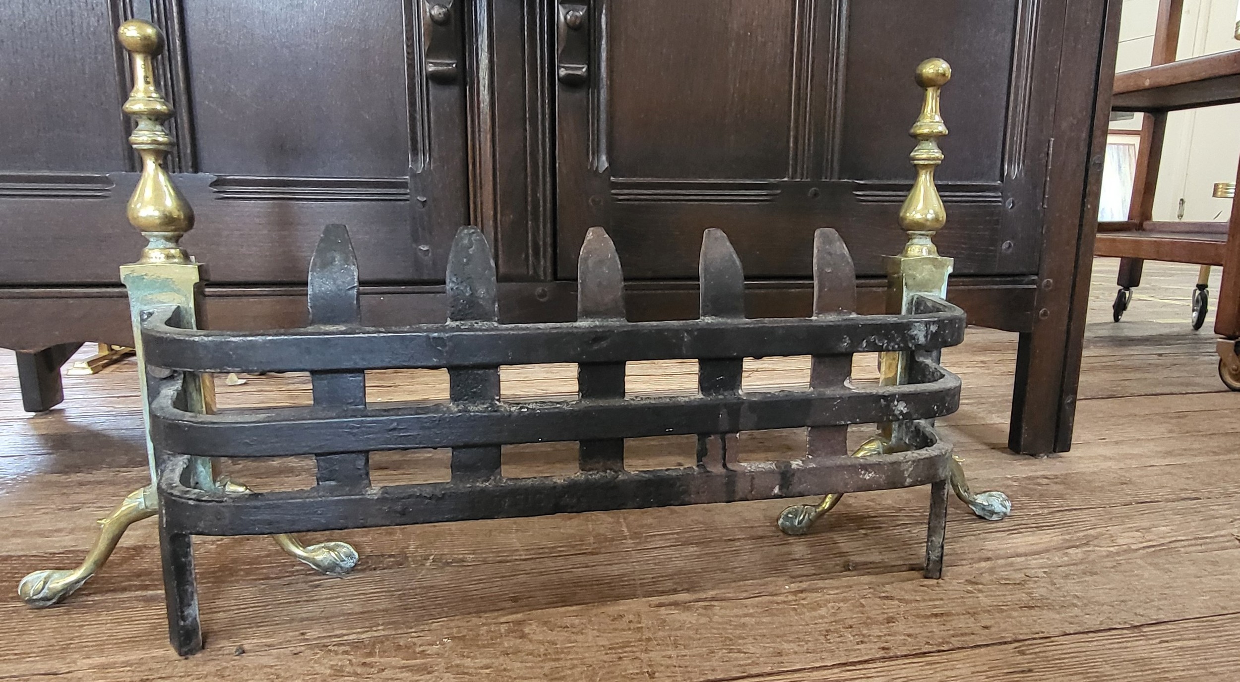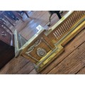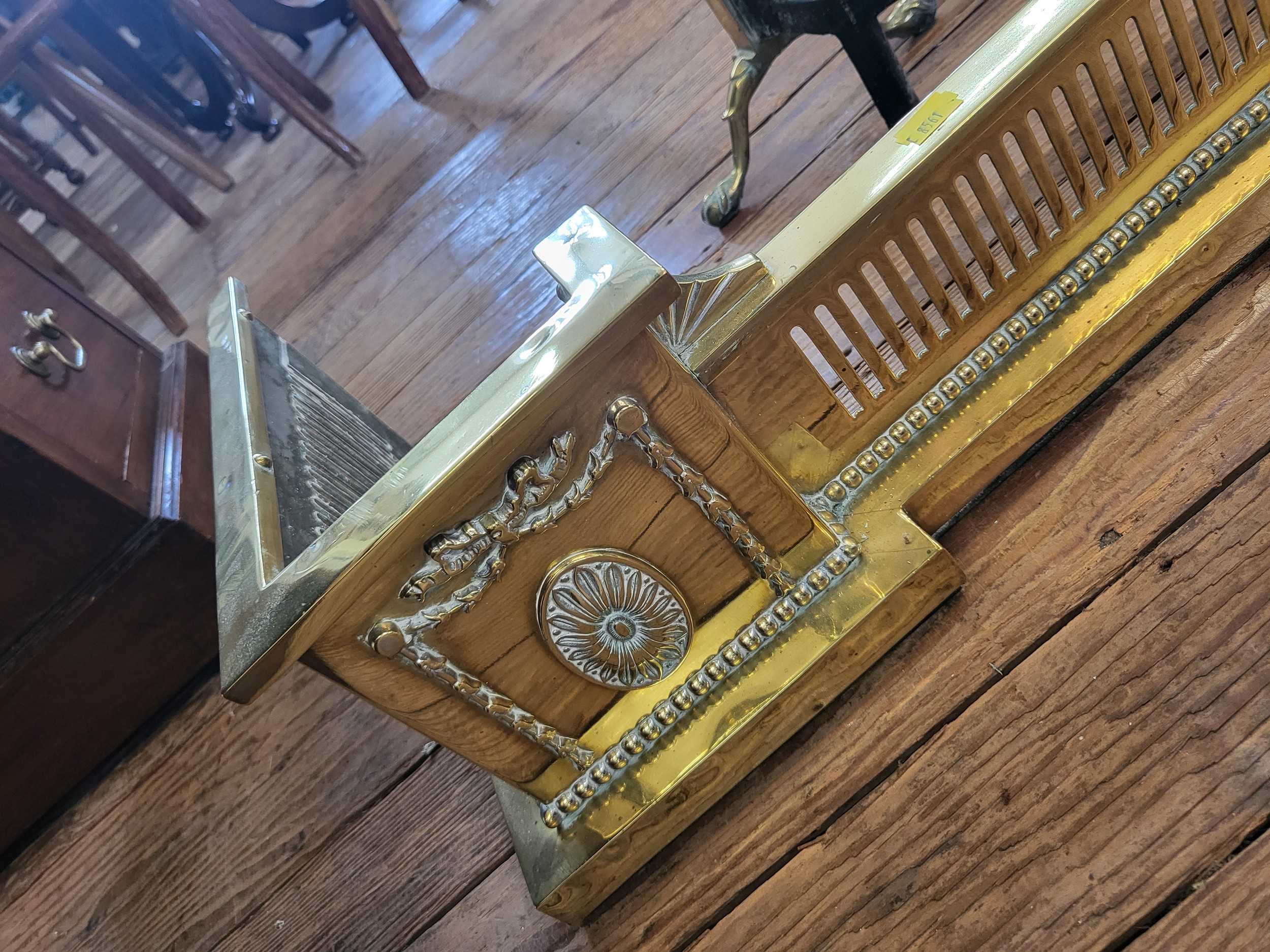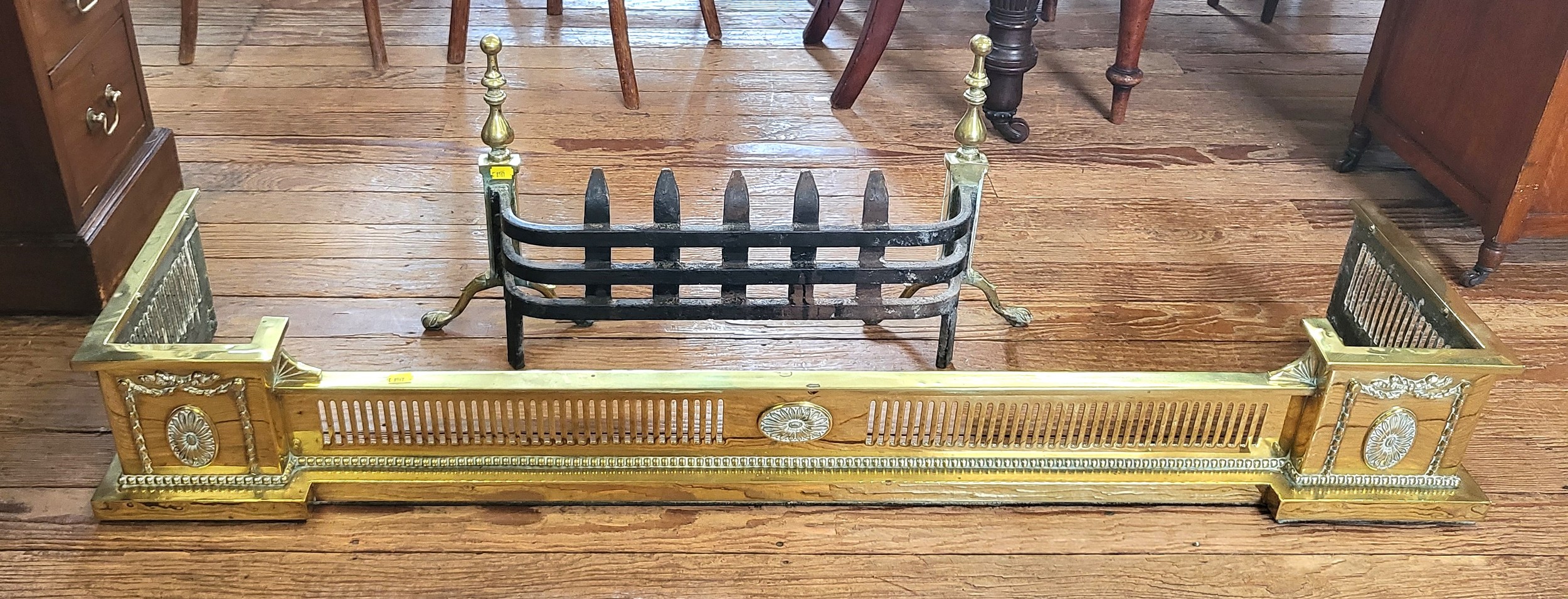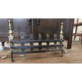 A brass fire dog W:73cm and brass fender W:133cm.
