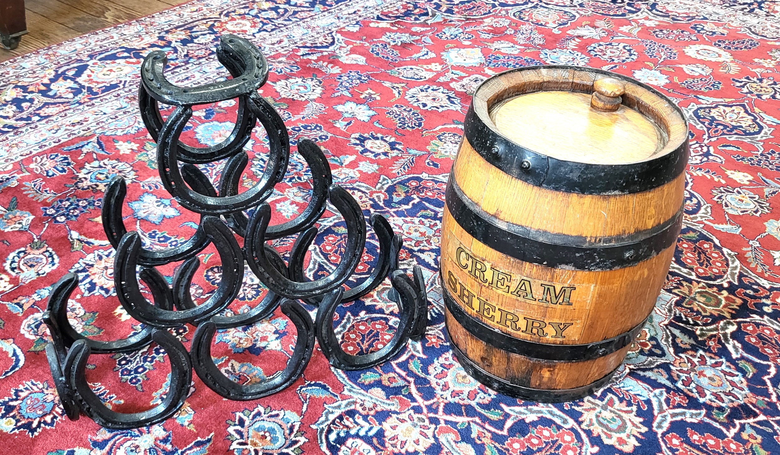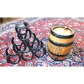 A miniature oak Cream Sherry cask 35cm x 24cm and horseshoe wine rack 41cm x 46cm x 21cm. (2)